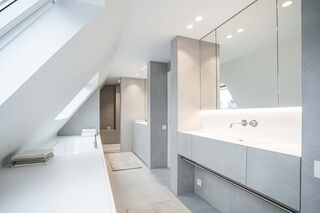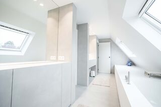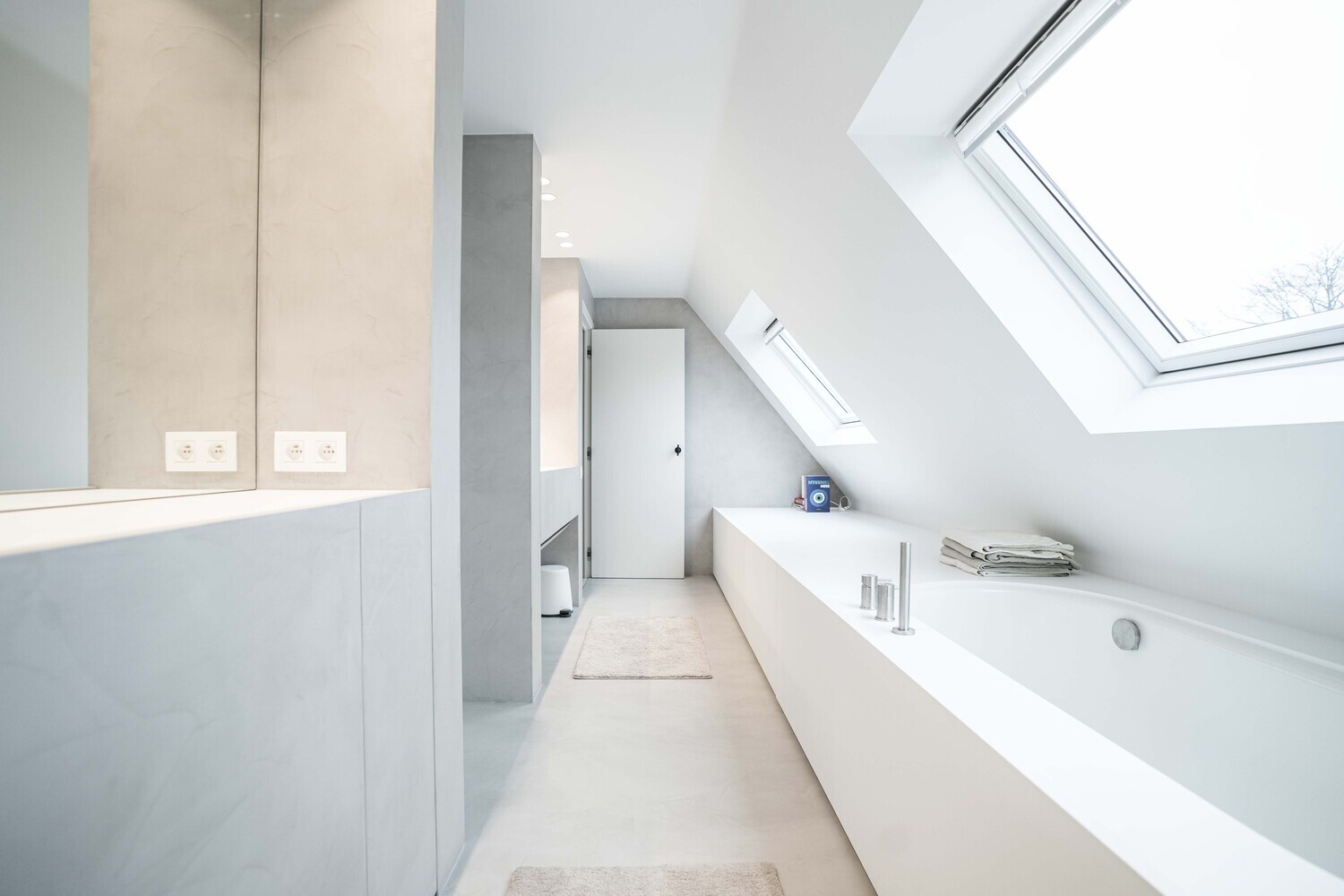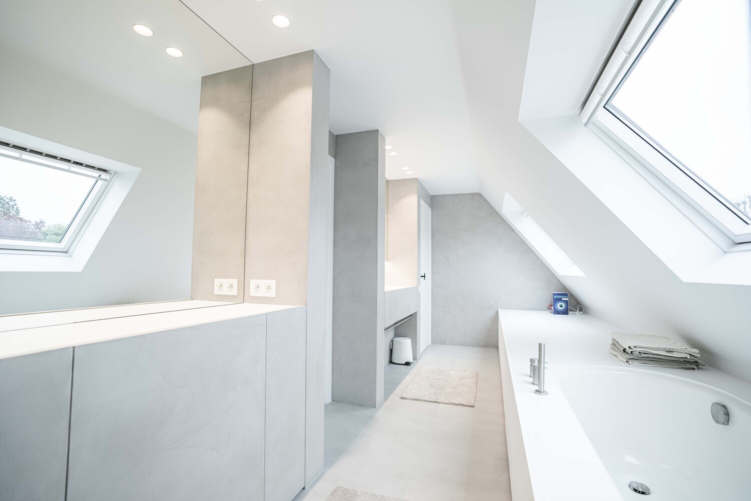 De vloer, kasten en wanden werden afgewerkt in StoneAge Basebeton in de tint 10-16 Dawn, een robuuste, naadloze look met een natuurlijke uitstraling. De tegenoverliggende wand en het plafond aan de Velux-zijde werden geschilderd in Libert Resacryl (RAL 9016 Verkeerswit), wat zorgt voor frisheid en lichtreflectie.